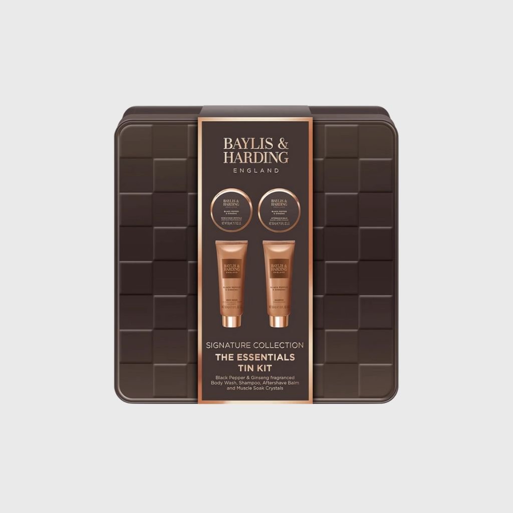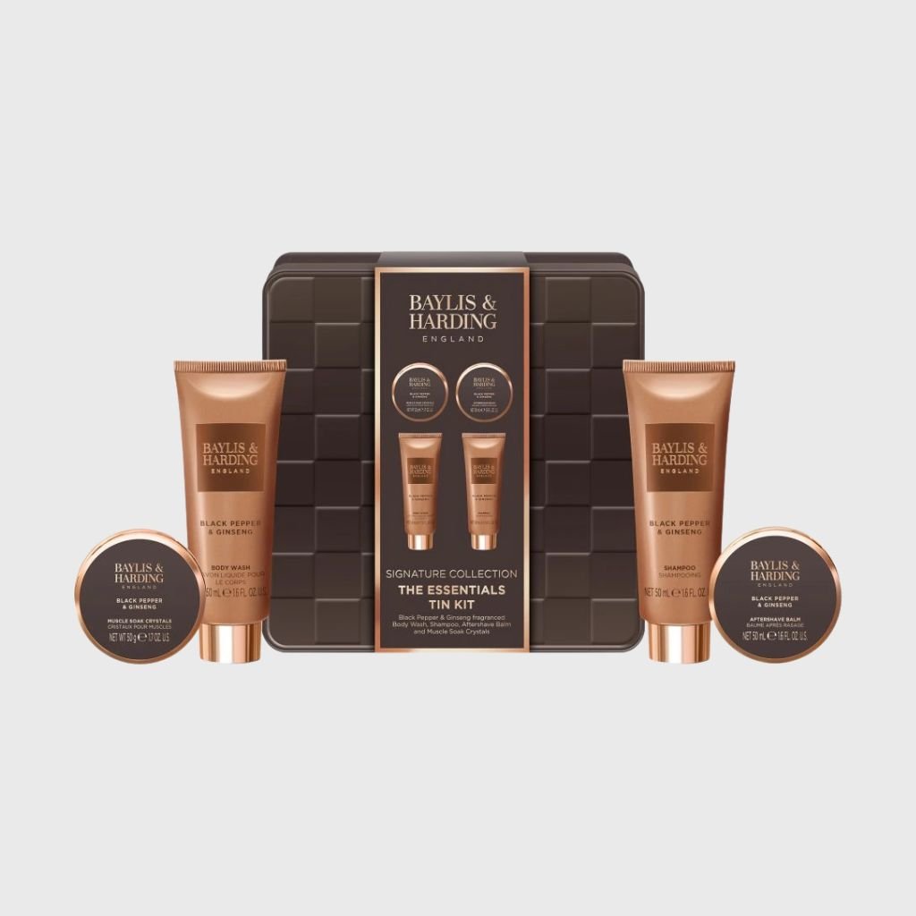 Baylis & Harding, Black Pepper & Ginseng, pánská mini sada, sprchový gel, šampon, balzám po holení, koupelové krystaly, cestovní balení, plechová dóza, pánská kosmetika, vánoční dárek, vegan, cruelty free, ovocně-kořeněná vůně.